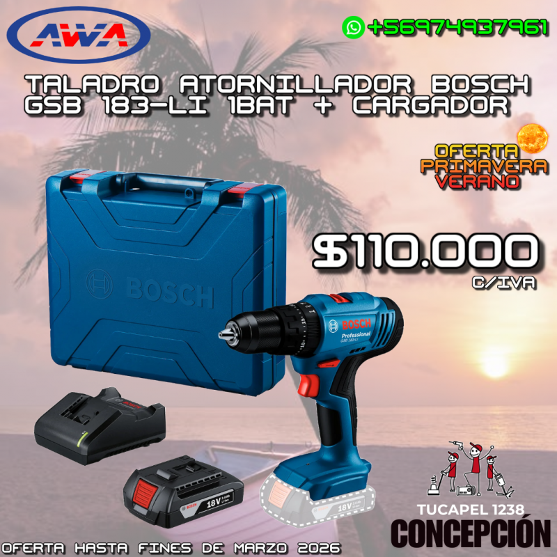 TALADRO ATORNILLADOR BOSCH GSB 183-LI 1 BATERIA + CARGADOR