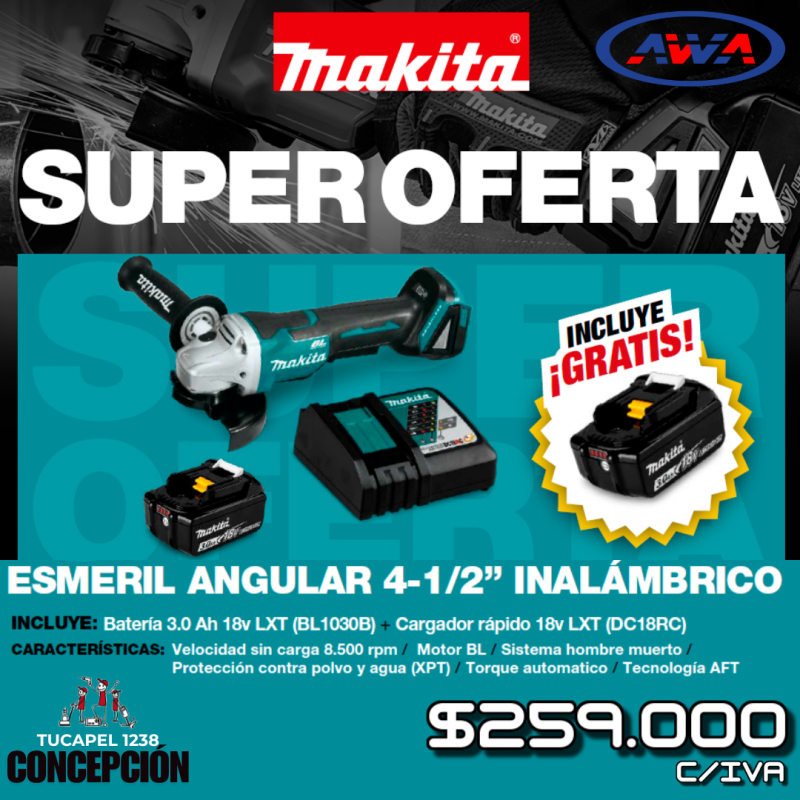 ESMERIL ANGULAR 4-1/2” MAKITA INALÁMBRICO 18V MODELO DGA...