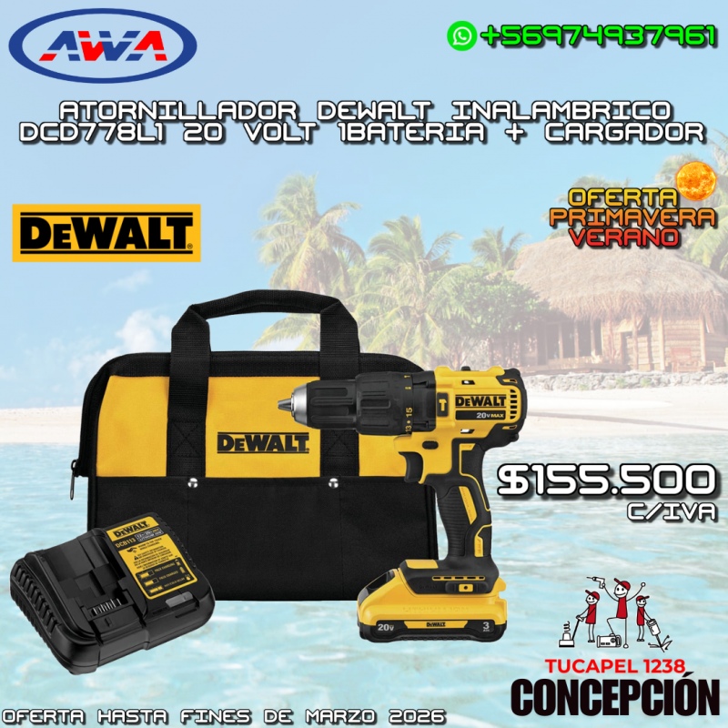 ATORNILLADOR DEWALT INAL. DCD778L1 20 VOLT 1 BATERIA + CARG...